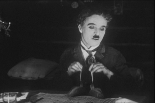 Charlot hace un baile con panecillos en La quimera del oro de Charles Chaplin.
